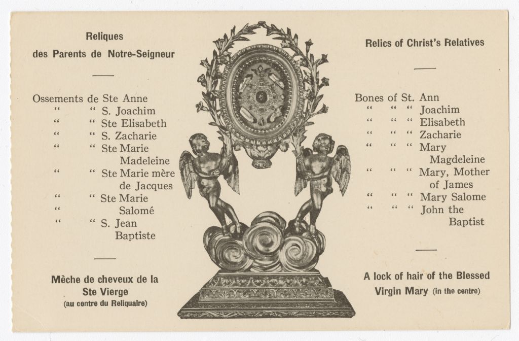 Reliques des parents de Notre-Seigneur, mèche de cheveux de la Ste Vierge (au centre du Reliquaire) = Relics of Christ's Relatives, a lock hair of the Blessed Virgin Mary (in the centre)