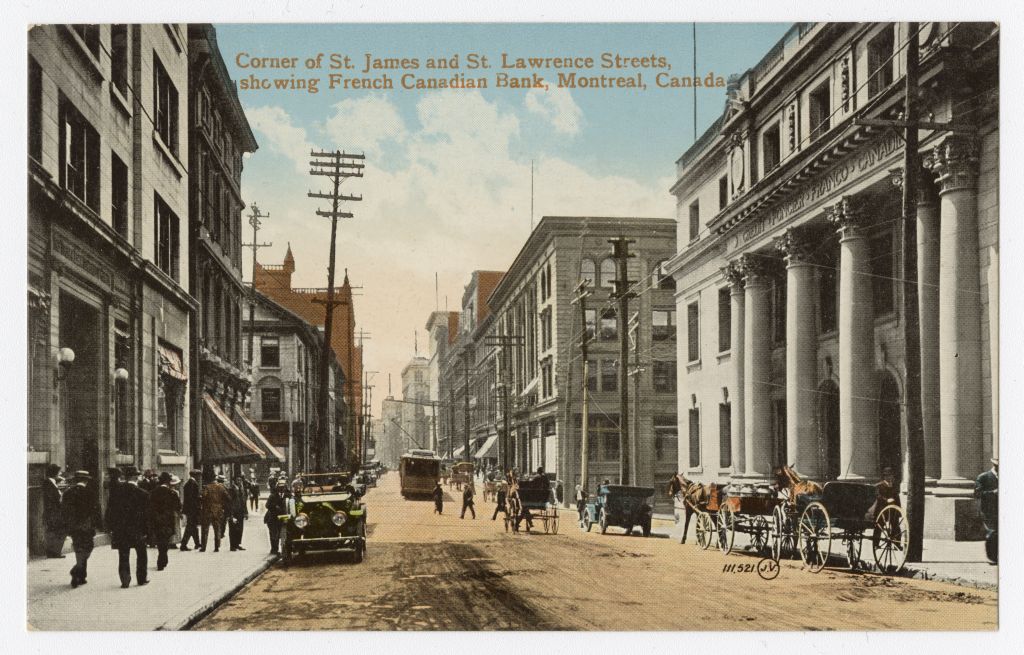 Corner of St. James and St. Lawrence Streets, showing French Canadian Bank, Montreal, Canada