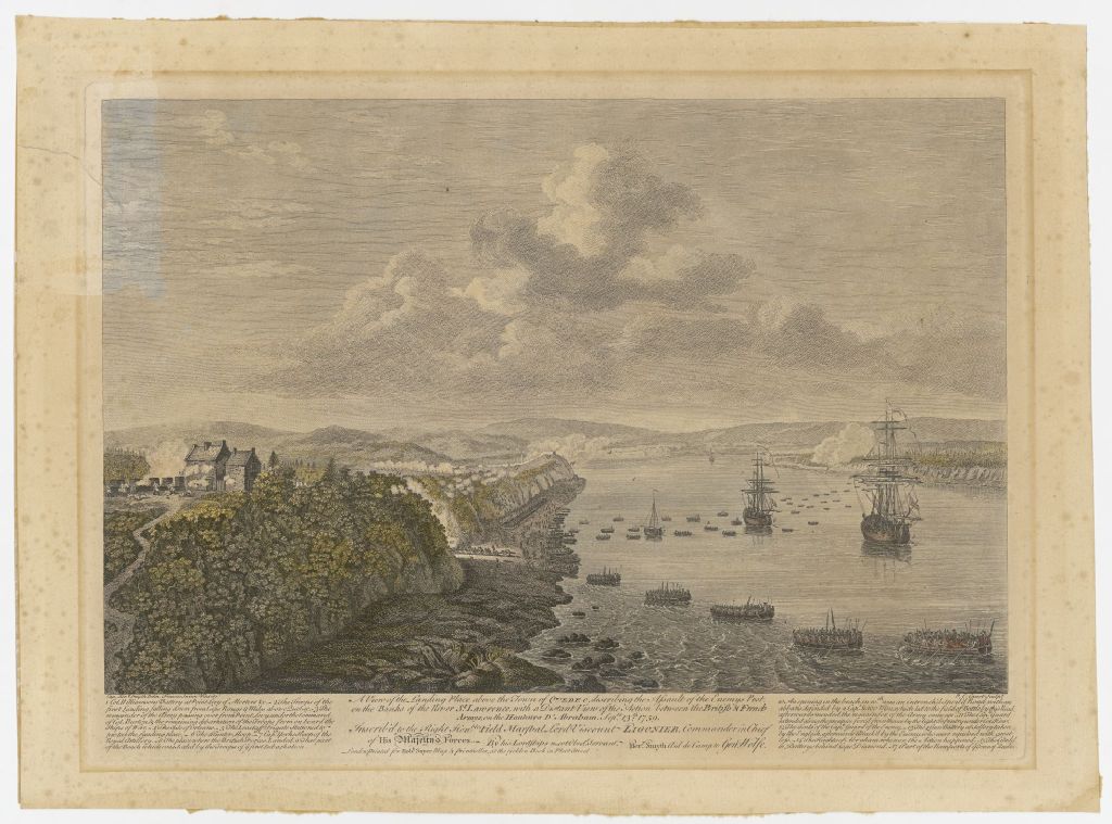 A view of the landing place above the town of Quebec describing the assault of the enemy post, on the banks of the River St. Lawrence, with a distant view of the action between the British & French Armys, on the Hauteurs d'Abraham, Sepbr 13th, 1759