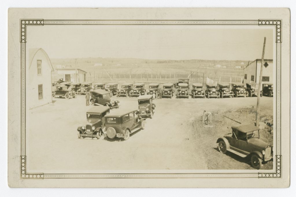 [Plusieurs voitures anciennes stationnées dans une cour] /
