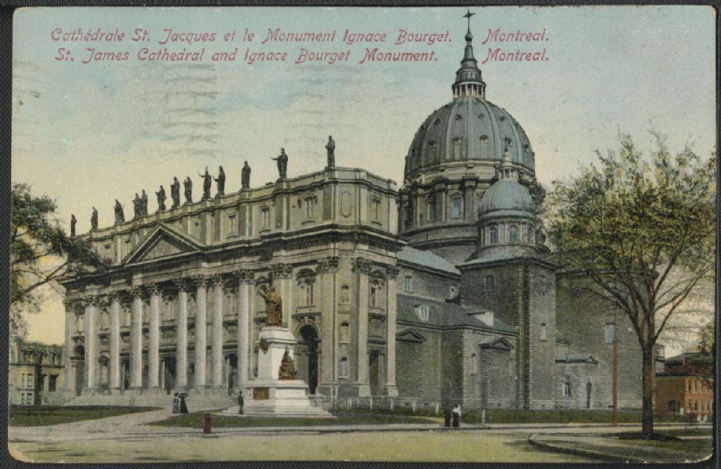 Cathédrale St. Jacques et le monument Ignace Bourget, Montréal = St. James Cathedral and Ignace Bourget Monument, Montreal