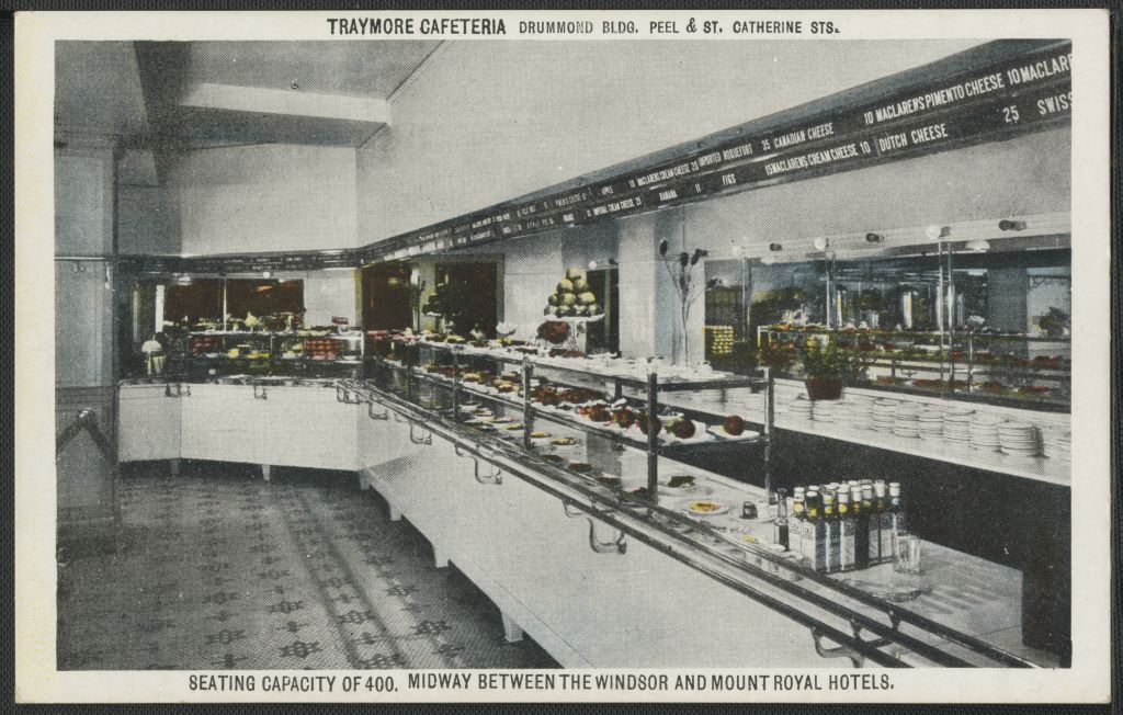 Traymore Cafeteria, Drummond Bldg. Peel & St. Catherine Sts. : seating capacity of 400, midway between the Windsor and Mount Royal hotels