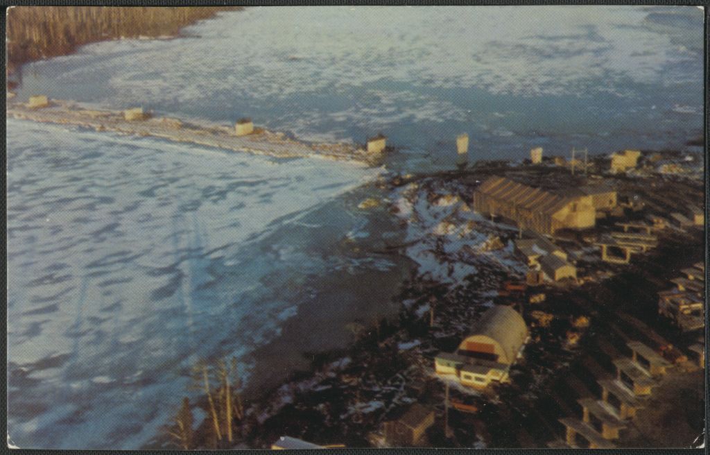 Souvenir de Matagami, Abitibi, P. Qué.,varietes Nel's Sundries Reg'd. : le pont qui éruni Matagami au Projet Baie James /