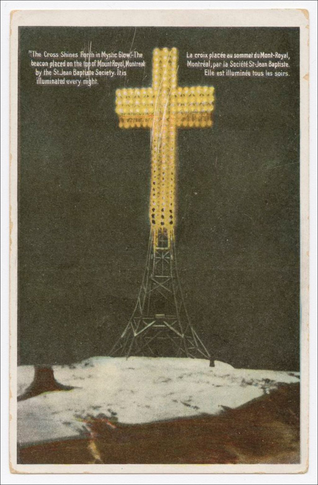 "The Cross shines forth in mystic glow." - The beacon placed on the top of Mount Royal, Montreal, by the St. Jean Baptiste Society. It is illuminated every night = La croix placée au sommet du Mont-Royal, Montréal, par la Société St-Jean Baptiste. Elle est illuminée tous les soirs