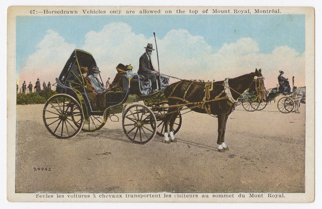 Horsedrawn vehicles only are allowed on the top of Mount-Royal, Montréal = Montréal, seules les voitures à chevaux transportent les visiteurs au sommet du Mont Royal