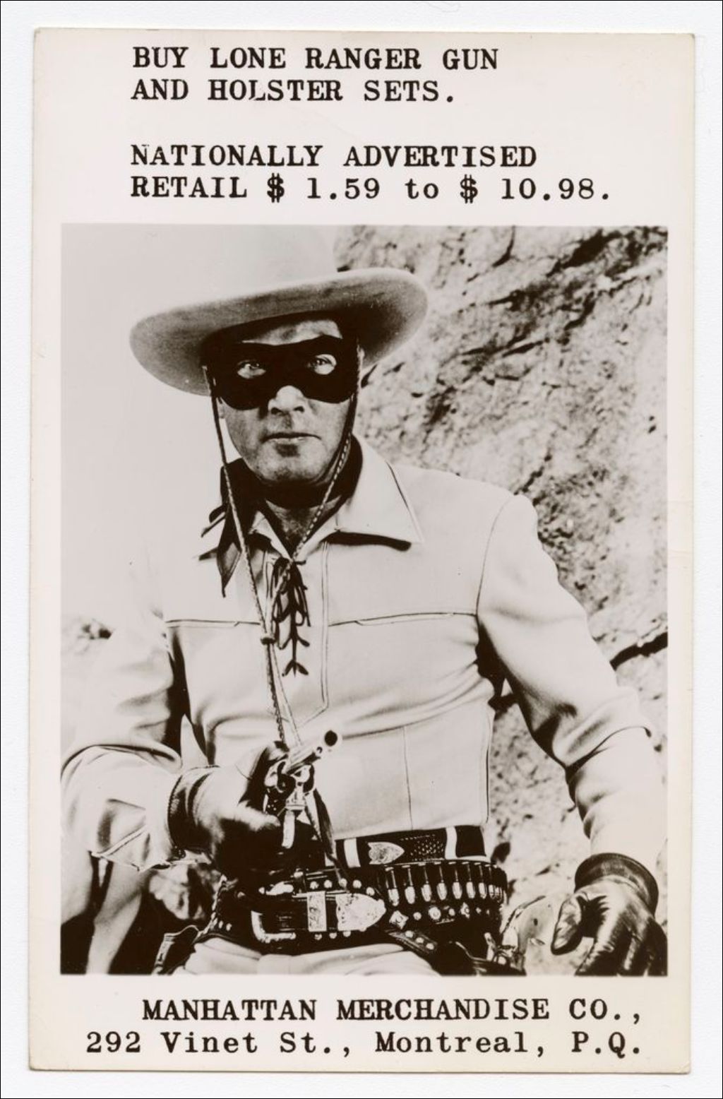 Buy lone ranger gun and holster sets, nationally advertised retail $1.59 to $10.98, Manhattan Merchandise Co. /