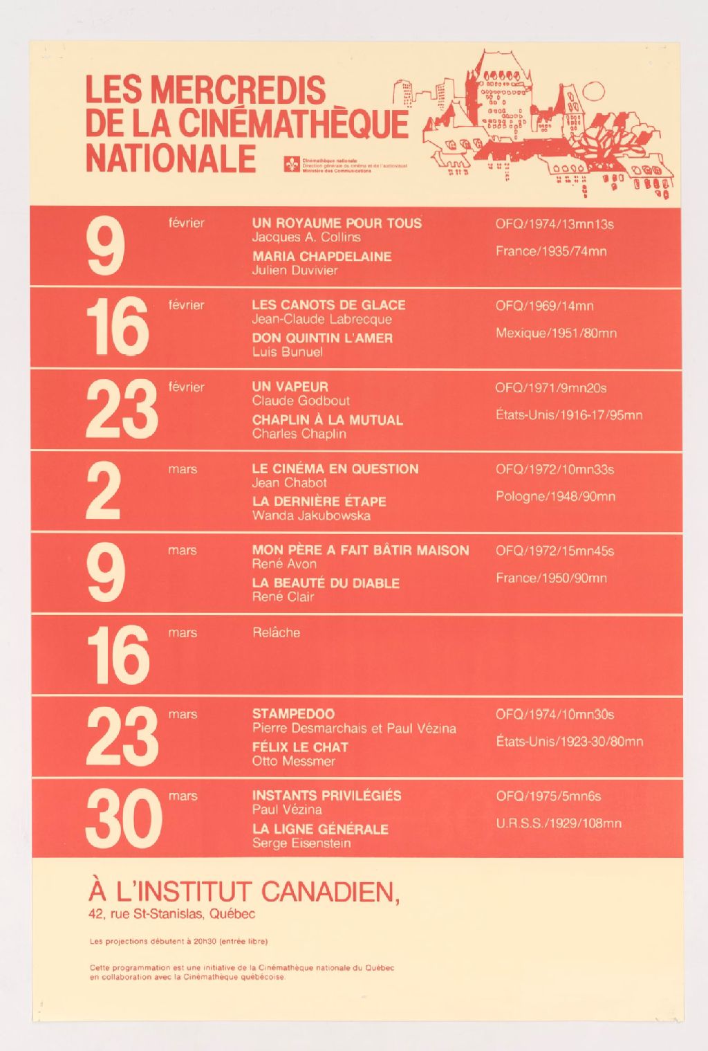 • [Québec] :Cinémathèque nationale, Direction générale du cinéma et de l'audiovisuel, Ministère des communications ;[1976?]