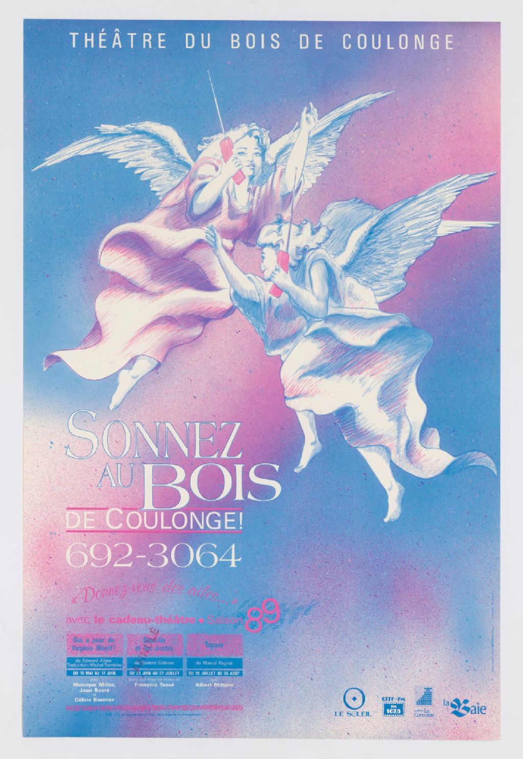 Sonnez au Bois de Coulonge donnez-vous des ailes-- avec le cadeau-théâtre, saison 89 : Qui à peur de Virginia Woolf... Bousille et les justes... Topaze...