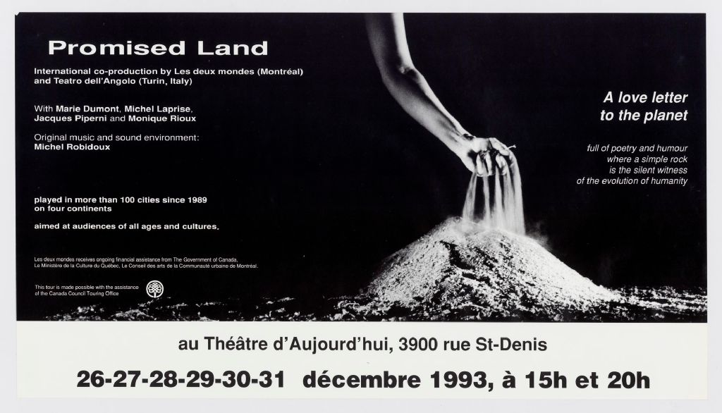 Promised land : a love letter to the planet : international co-production by Les Deux mondes (Montréal) and Teatro dell'Angolo (Turin, Italy), with Marie Dumont, Michel Laprise, Jacques Piperni and Monique Rioux ... played in more than 100 cities since 1989 on four continents ...