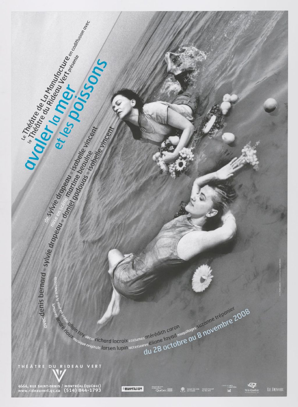Le Théâtre de la manufacture en codiffusion avec le Théâtre du rideau vert présente Avaler la mer et les poissons, de Sylvie Drapeau [et] Isabelle Vincent, mise en scène Martine Beaulne Théâtre du Rideau Vert...