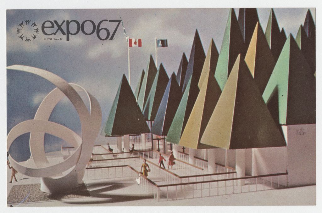 Expo67, Montréal, Canada : pavillon de l'Association Canadienne des Pâtes et Papier... Une structure imaginative représentant une forêt stylisée ... = The Canadian Pulp and Paper Pavilion... An imaginative building representing a stylized forest ... /