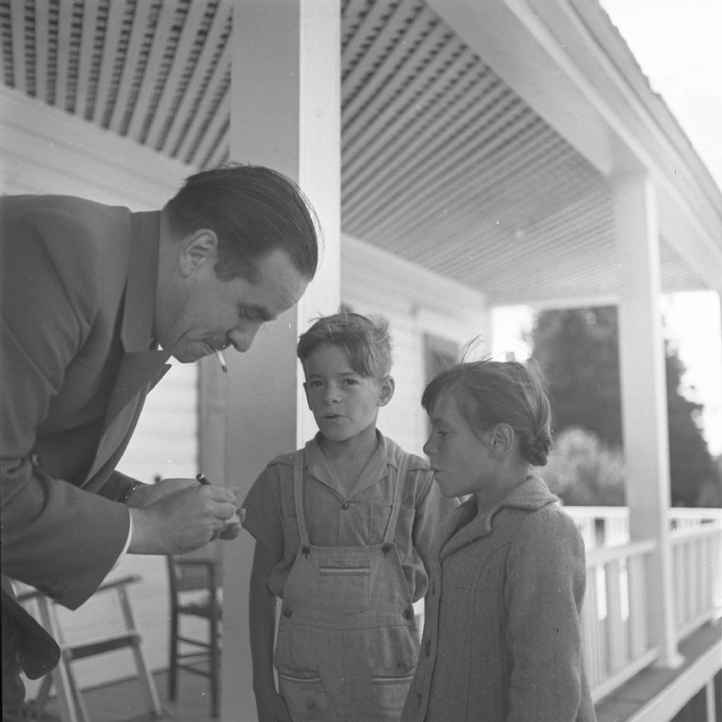 Paul Gouin avec des jeunes fans sur la galerie du Manoir Saint-Georges, Port-Daniel, 1950, Archives nationales à Québec, Fonds Lida Moser, (03Q,P728,S1,D1,P11-25), Lida Moser.