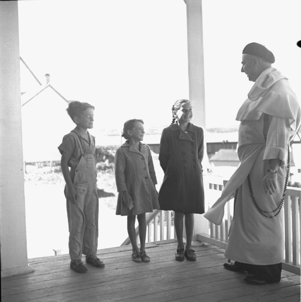 Dominicain de la France avec des enfants sur la galerie du Manoir Saint-Georges, Port-Daniel, 1950, Archives nationales à Québec, Fonds Lida Moser, (03Q,P728,S1,D1,P11-31), Lida Moser.