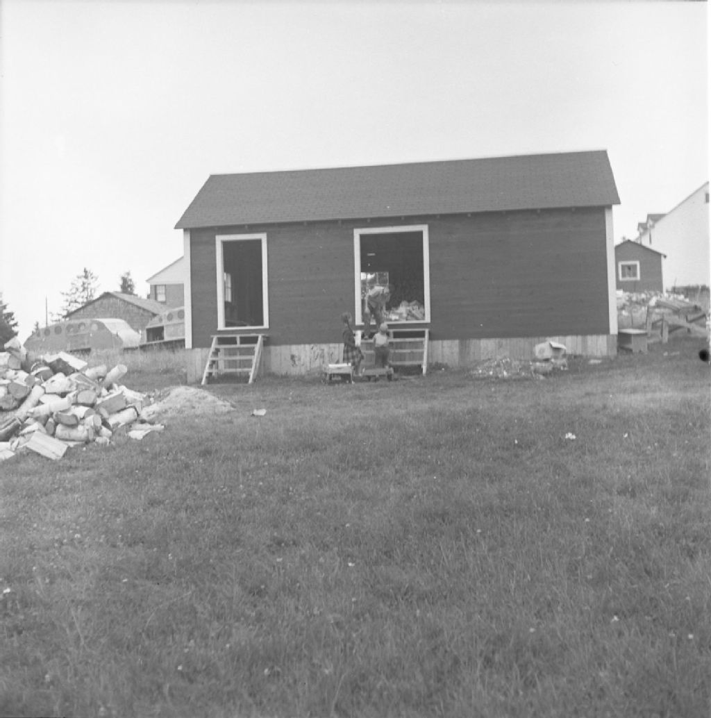 Vue sur un hangar à bois de chauffage à Gaspé, 1950, Archives nationales à Québec, Fonds Lida Moser, (03Q,P728,S1,D1,P15-34), Lida Moser.