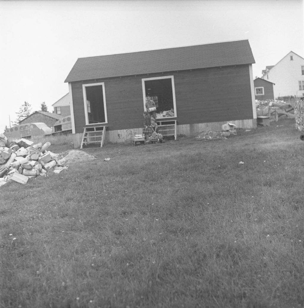 Vue sur un hangar à bois de chauffage à Gaspé, 1950, Archives nationales à Québec, Fonds Lida Moser, (03Q,P728,S1,D1,P15-35), Lida Moser.