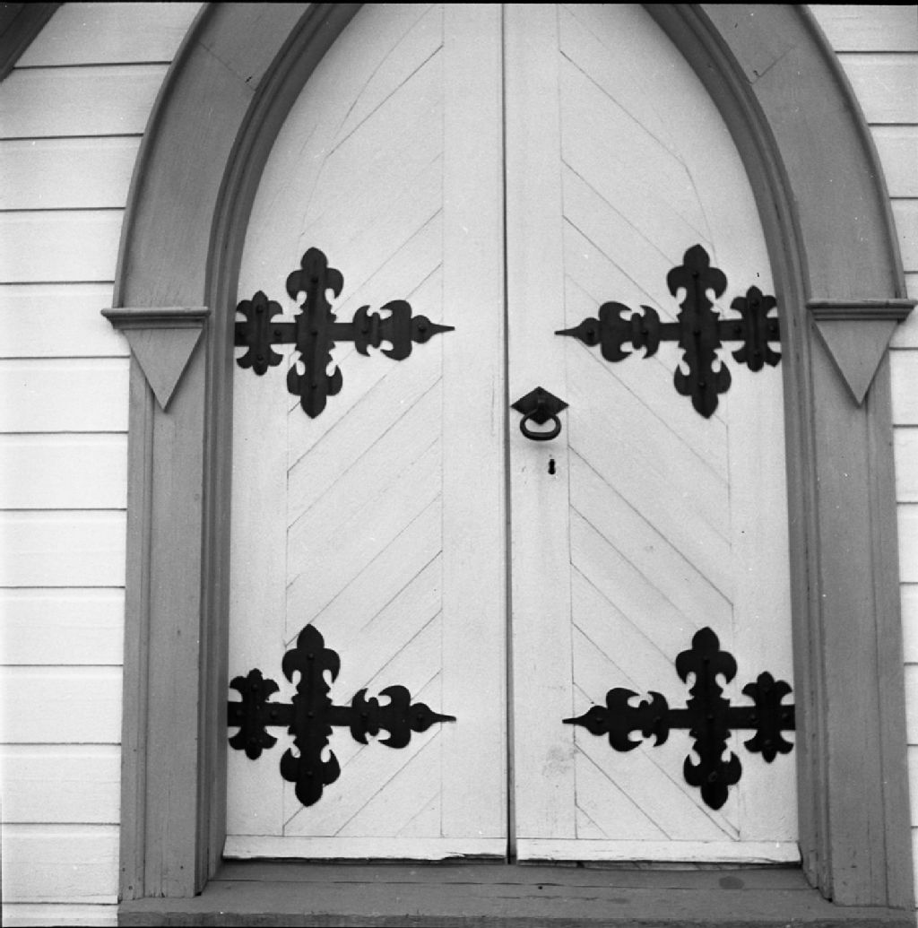 Vue rapprochée de la porte de l'église anglicane Saint-Luc (St. Luke's Anglican Church) de Percé, 1950, Archives nationales à Québec, Fonds Lida Moser, (03Q,P728,S1,D1,P15-4), Lida Moser.