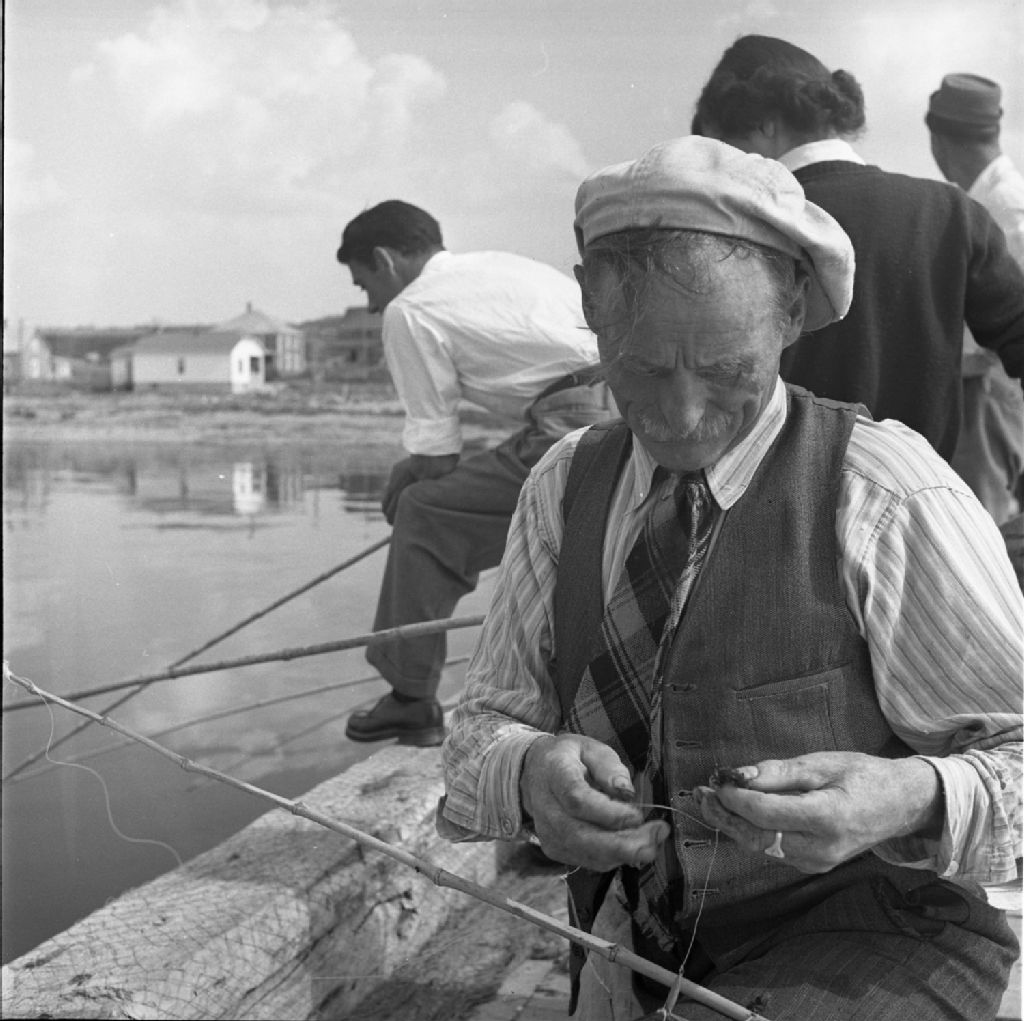 Damase Bernier et autres pêcheurs à l'éperlan sur le quai de Baie-des-Sables [ou Trois-Pistoles], 1950, Archives nationales à Québec, Fonds Lida Moser, (03Q,P728,S1,D1,P16-5), Lida Moser.