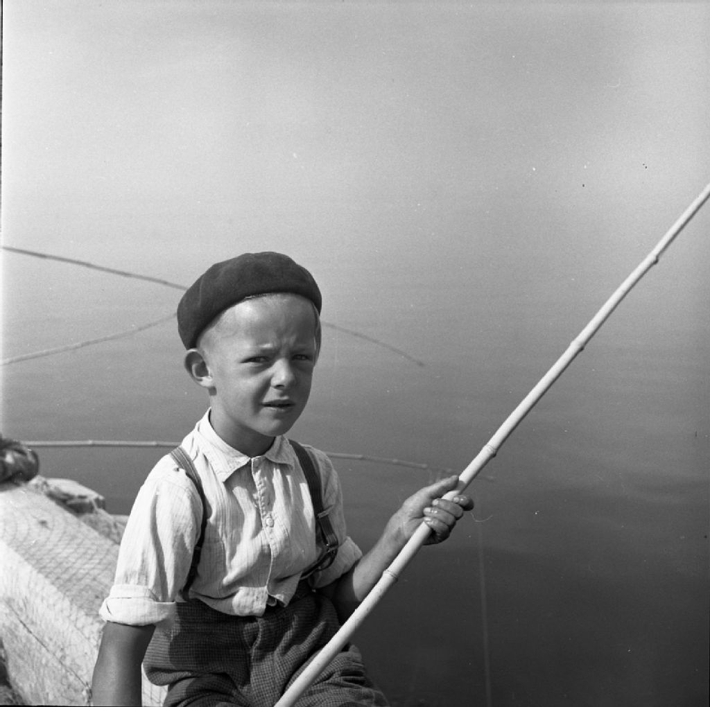 Jeune pêcheur à l'éperlan sur le quai de Trois-Pistoles [ou Baie-des-Sables], 1950, Archives nationales à Québec, Fonds Lida Moser, (03Q,P728,S1,D1,P16-6), Lida Moser.