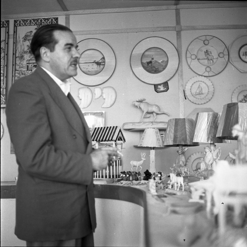 Paul Gouin dans une boutique d'artisanat en sculpture et peinture sur bois, Saint-Jean-Port-Joli, 1950, Archives nationales à Québec, Fonds Lida Moser, (03Q,P728,S1,D1,P17-70), Lida Moser.
