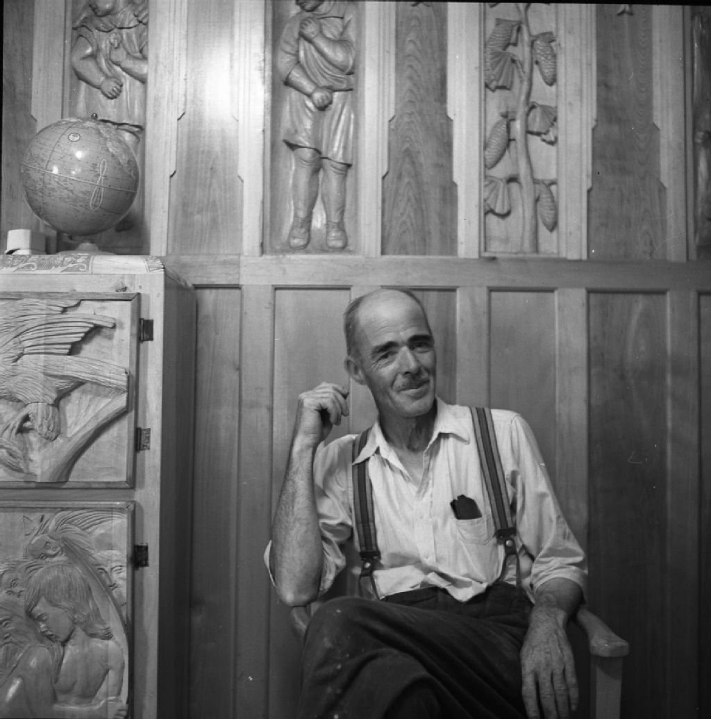 Médard Bourgault, sculpteur, à l'intérieur de son atelier, Saint-Jean-Port-Joli, 1950, Archives nationales à Québec, Fonds Lida Moser, (03Q,P728,S1,D1,P18-6), Lida Moser.