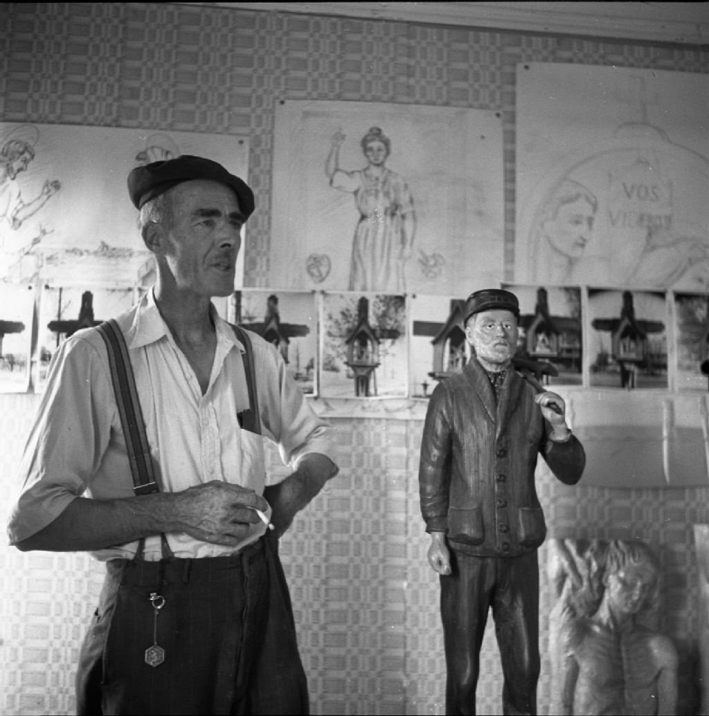 Médard Bourgault, sculpteur, à l'intérieur de son atelier, Saint-Jean-Port-Joli, 1950, Archives nationales à Québec, Fonds Lida Moser, (03Q,P728,S1,D1,P18-9), Lida Moser.