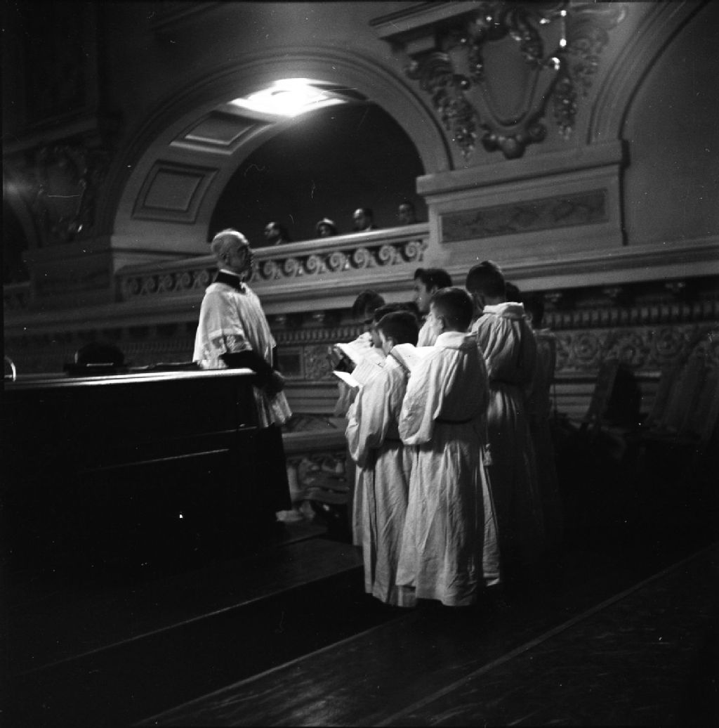 L'abbé Joseph De Smet et les petits chanteurs à la croix de bois de Québec, basilique-cathédrale Notre-Dame-de-Québec, 1950, Archives nationales à Québec, Fonds Lida Moser, (03Q,P728,S1,D1,P19-19), Lida Moser.