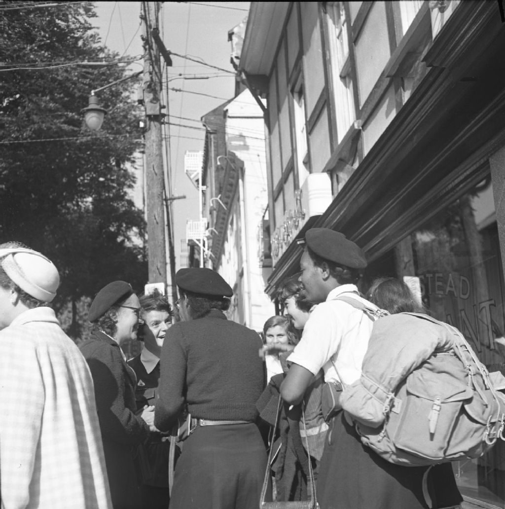 Un regroupement de voyageurs pour le transport par autobus au terminus de la rue Sainte-Anne, Vieux-Québec, 1950, Archives nationales à Québec, Fonds Lida Moser, (03Q,P728,S1,D1,P19-5), Lida Moser.