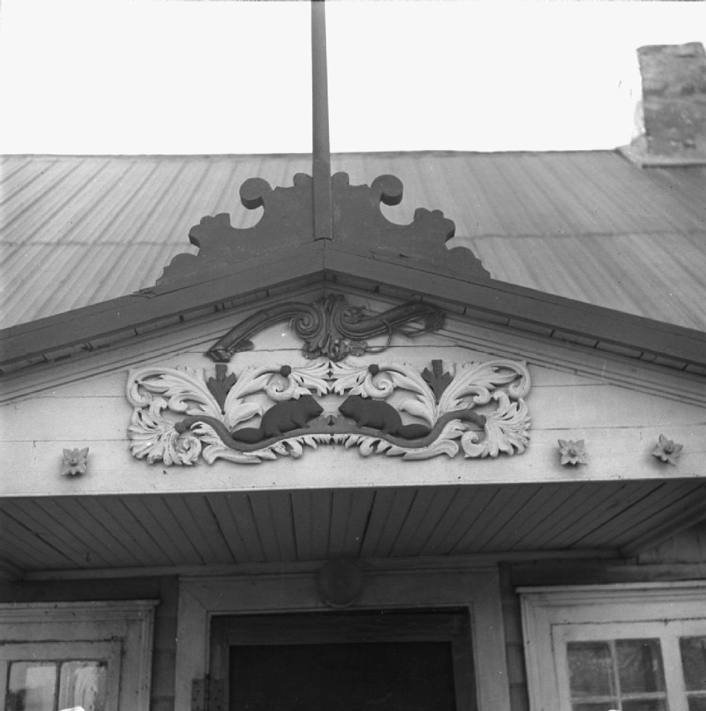 Détail de la porte de l'atelier boutique de Joseph Shink, sculpteur, Beaumont, 1950, Archives nationales à Québec, Fonds Lida Moser, (03Q,P728,S1,D1,P20-68), Lida Moser.