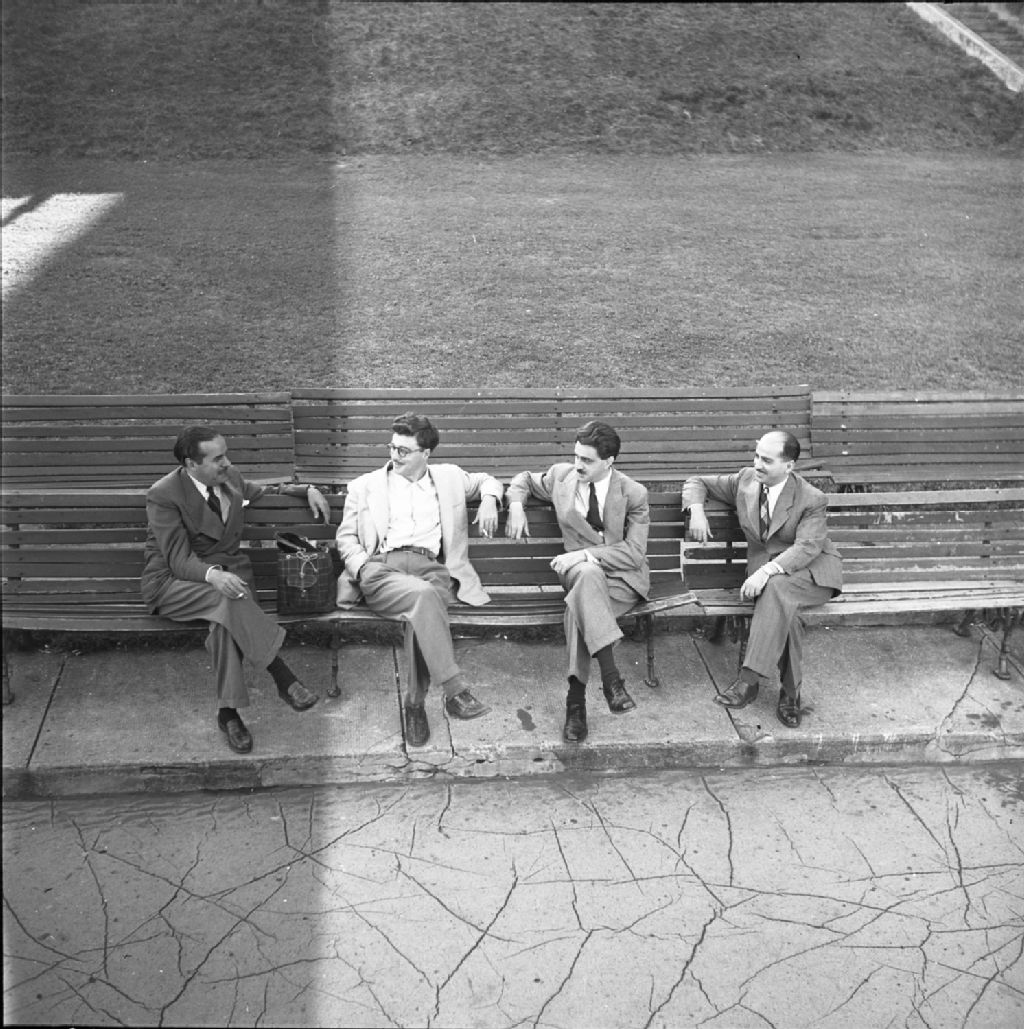 Paul Gouin, Roger Lemelin, André Giroux et René Arthur sur un banc de la terrasse-Dufferin, 1950, Archives nationales à Québec, Fonds Lida Moser, (03Q,P728,S1,D1,P21-18), Lida Moser.