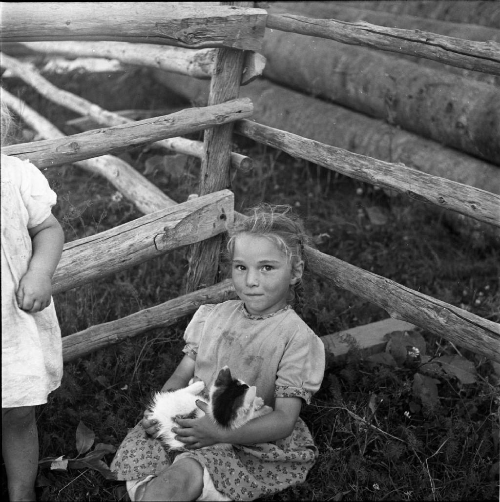Vue d'une fillette et son chat, Vallée de la Matapédia, 1950, Archives nationales à Québec, Fonds Lida Moser, (03Q,P728,S1,D1,P9-16), Lida Moser.