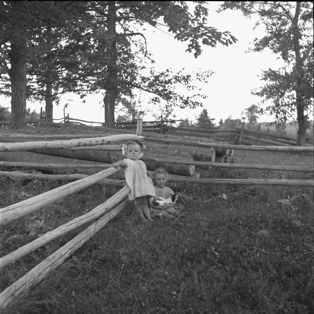 Fillettes avec leur chat, Vallée de la Matapédia, 1950, Archives nationales à Québec, Fonds Lida Moser, (03Q,P728,S1,D1,P9-17), Lida Moser.