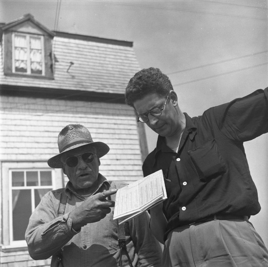 Luc Lacourcière discutant avec un homme, Vallée de la Matapédia, 1950, Archives nationales à Québec, Fonds Lida Moser, (03Q,P728,S1,D1,P9-8), Lida Moser.