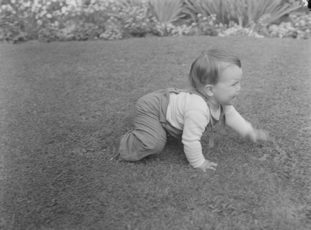 Le fils de Betty Matheson rampe en salopette sur l'herbe d'un jardin