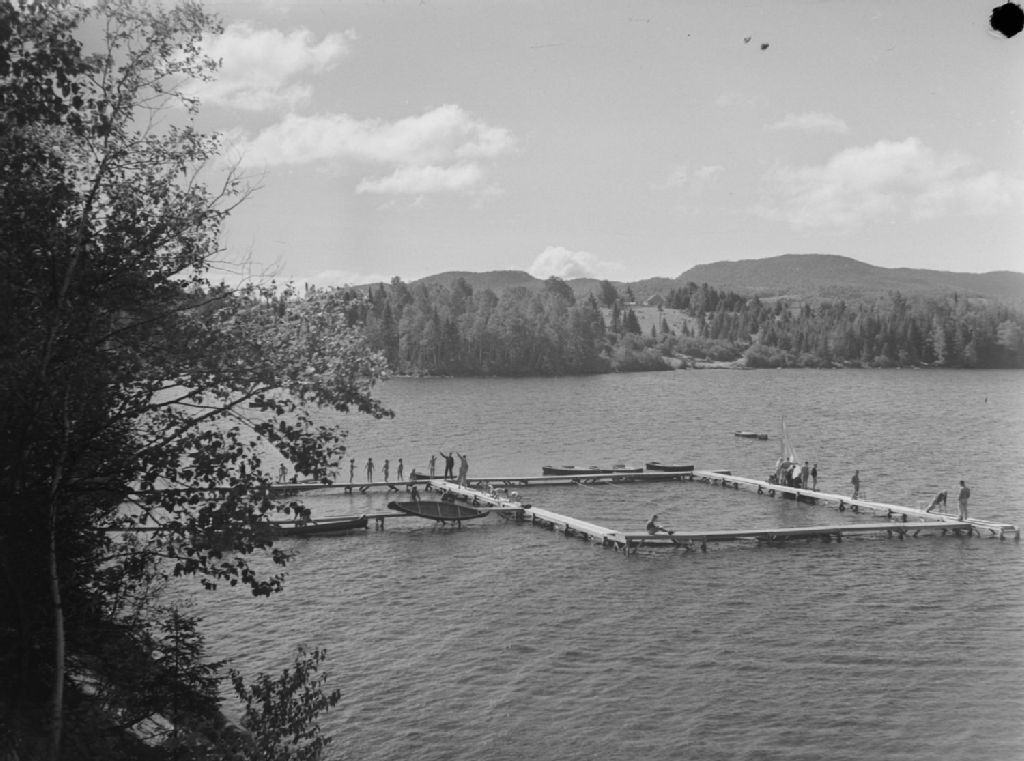 Nous avons une vue d'ensemble des installations nautiques de la colonie de vacances «Powter's Camp». Nous voyons plusieurs baigneurs debout sur des pontons