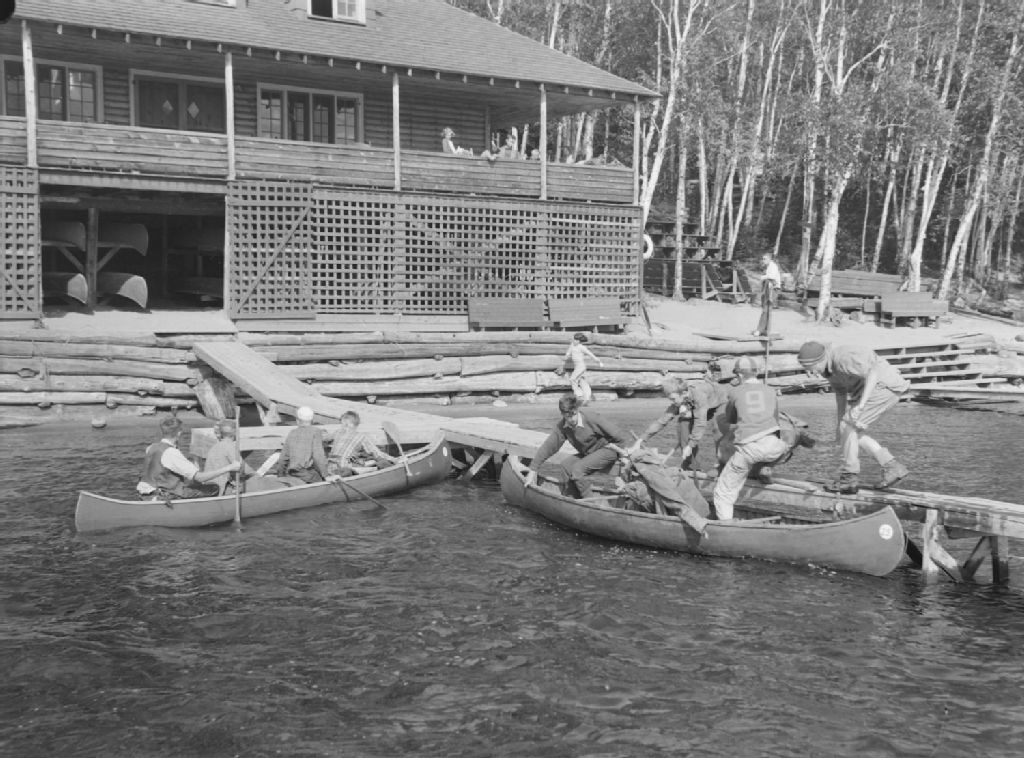 Des campeurs accostent leurs canots le long d'un ponton situé devant le chalet principal de la colonie de vacances «Powter's Camp»