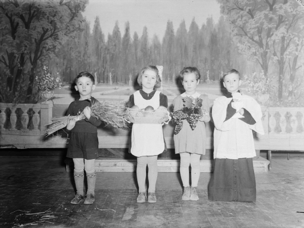 Nous voyons quatre élèves de l'école maternelle des Soeurs franciscaines missionnaires de Marie située au 80, avenue Laurier Est à Montréal. Ils présentent le sacrement de l'Eucharistie, les bras chargés de blé, de petits pains et de raisins. Un petit garçon, en soutane et surplis, tient un calice et élève l'hostie