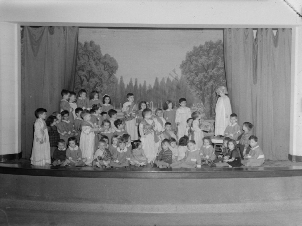 Nous voyons un groupe d'enfants, dont certains sont costumés, de l'école maternelle des Soeurs franciscaines missionnaires de Marie située au 80, avenue Laurier Est à Montréal. Ils présentent le miracle de la multiplication des pains
