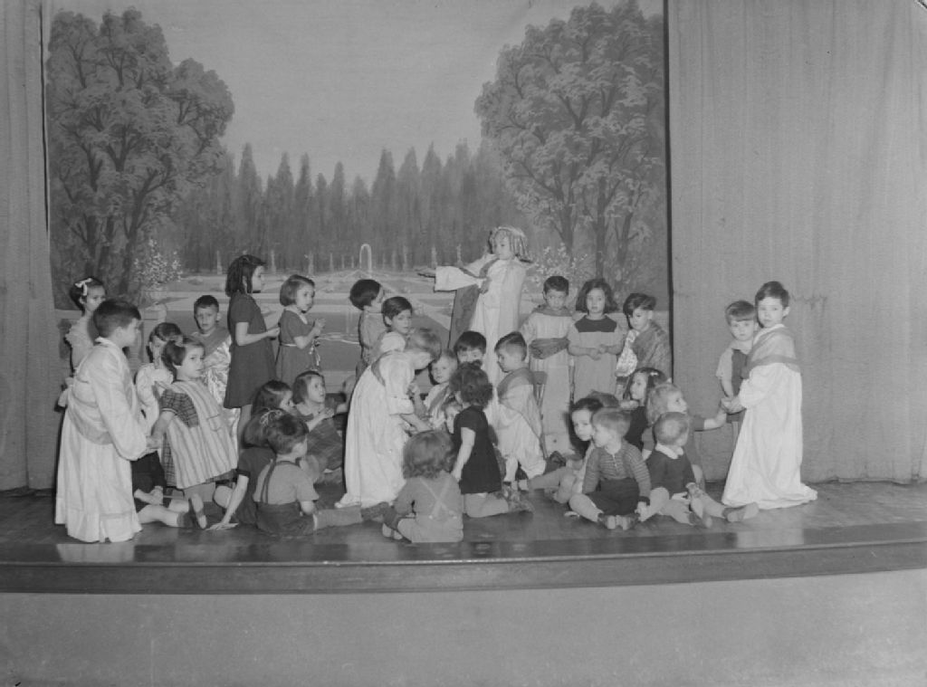 Nous voyons un groupe d'enfants, dont certains sont costumés, de l'école maternelle des Soeurs franciscaines missionnaires de Marie située au 80, avenue Laurier Est à Montréal. Ils présentent un épisode de la vie du Christ prêchant à la foule. Ses apôtres sont avec lui