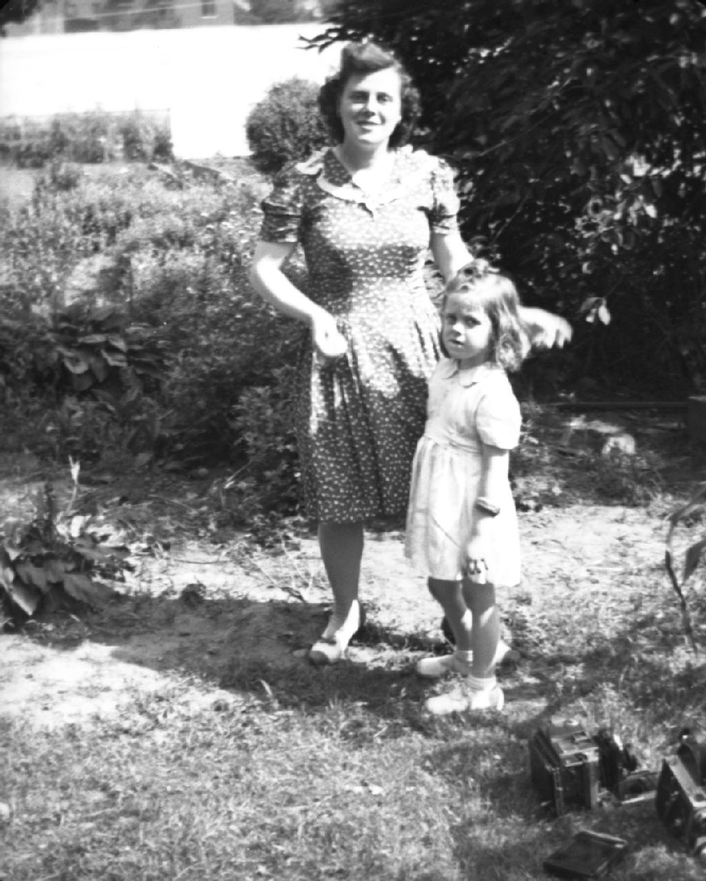 Fernande et Pierrette [Lambert] sont debout dans un jardin