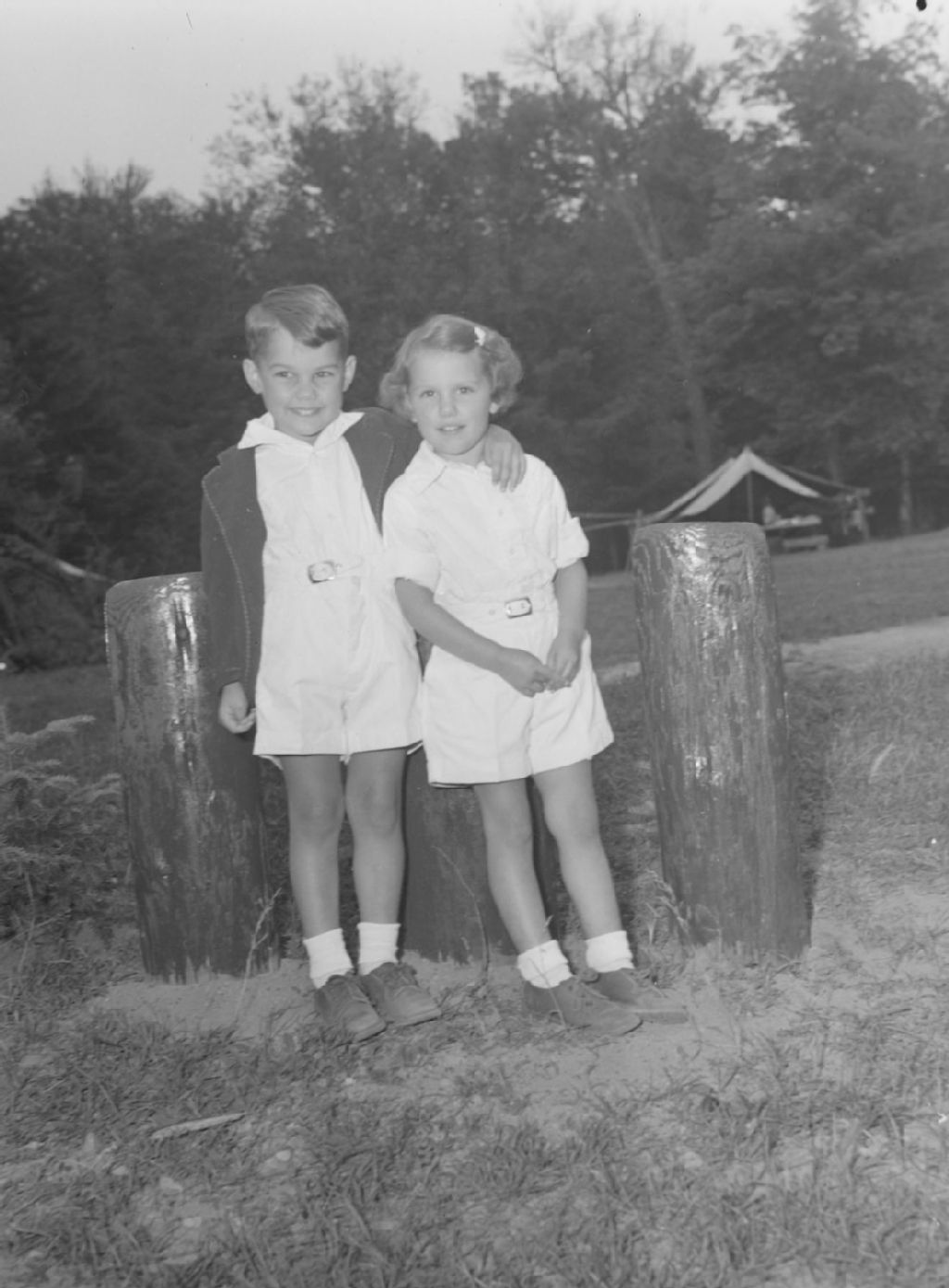 Nous voyons les enfants de monsieur Hugh Noble debout sur l'herbe. Nous remarquons une tente devant des arbres à l'arrière-plan