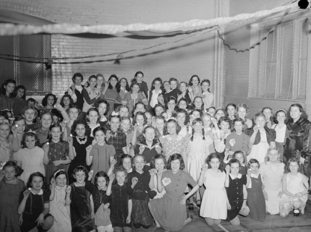 Des fillettes et des jeunes filles ont toutes un jeton à la main à la partie de Noël de la North End Young Men's Christian Association (Y.M.C.A.) de Montréal