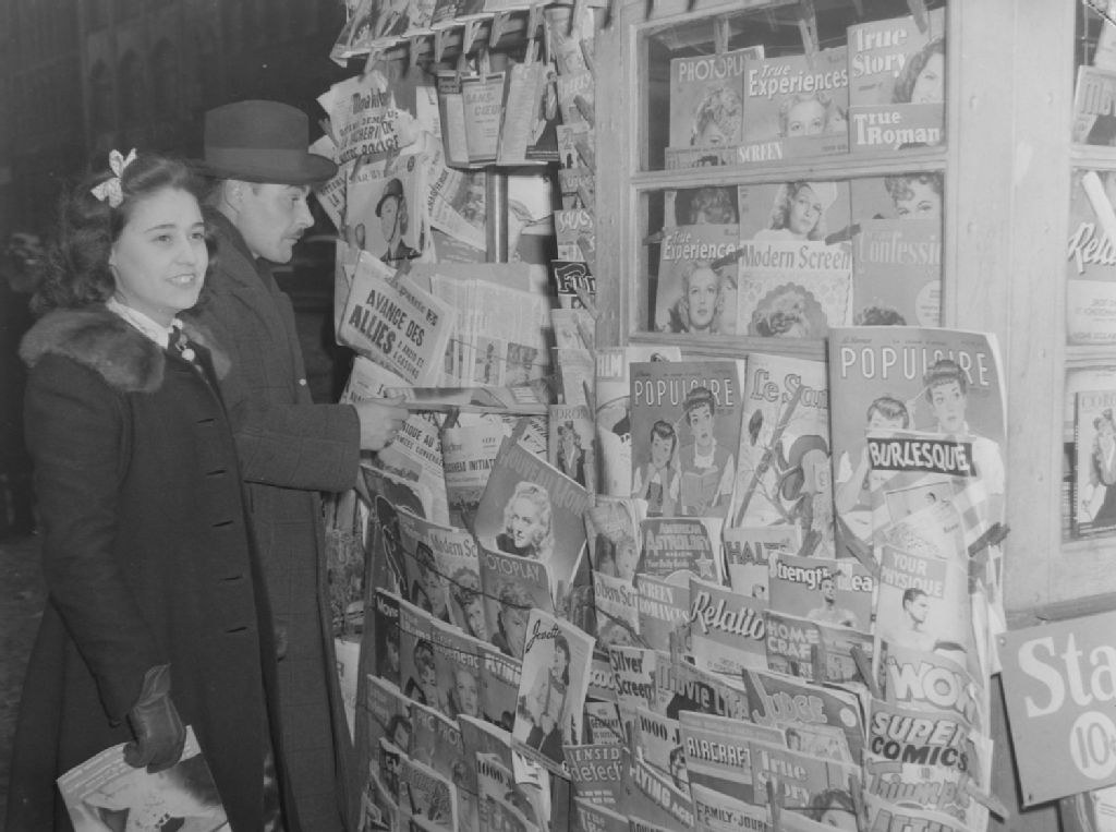 Thérèse Desjardins et Hector Brault achètent le périodique montréalais «Le Samedi» dans un kiosque à journaux. À la une du journal «La Patrie» nous lisons «Avance des Alliés»