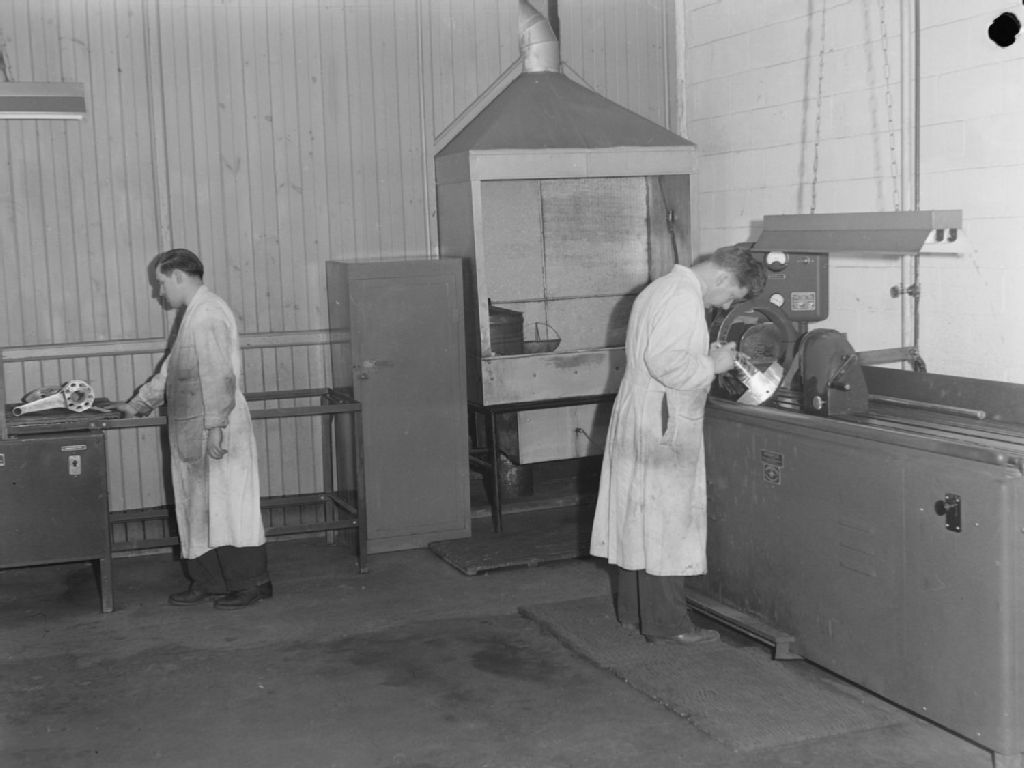 Nous voyons deux ouvriers travaillant à l'usine d'assemblage de moteurs d'avion Canadian Wright Limited située sur la rue Notre-Dame Est à Montréal