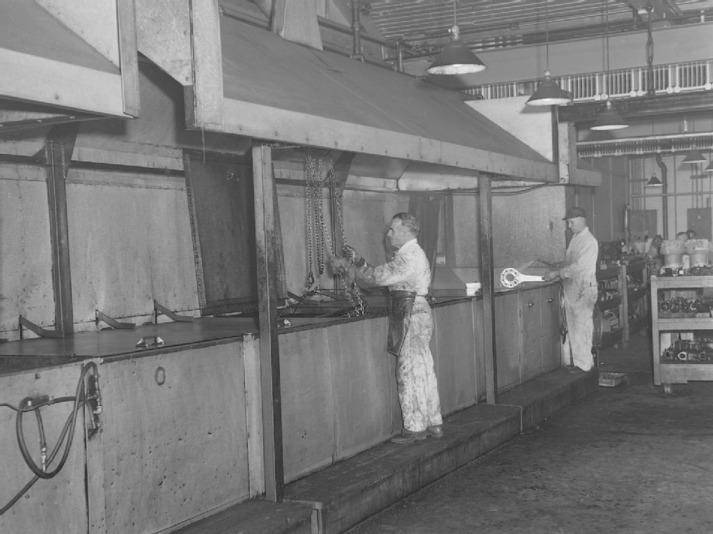 Nous voyons deux ouvriers travaillant à l'usine d'assemblage de moteurs d'avion Canadian Wright Limited située sur la rue Notre-Dame Est à Montréal