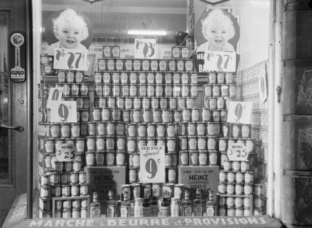 Nous voyons un étalage de produits en conserve de la compagnie Heinz dans la vitrine de l'épicerie Tousignant & Frère, rue Wellington à Verdun