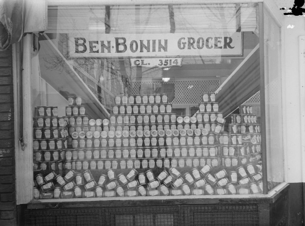 Nous voyons un étalage de soupe en conserve de la compagnie Heinz dans la vitrine de l'épicerie Benjamin Bonin sur la rue Dandurand à Montréal