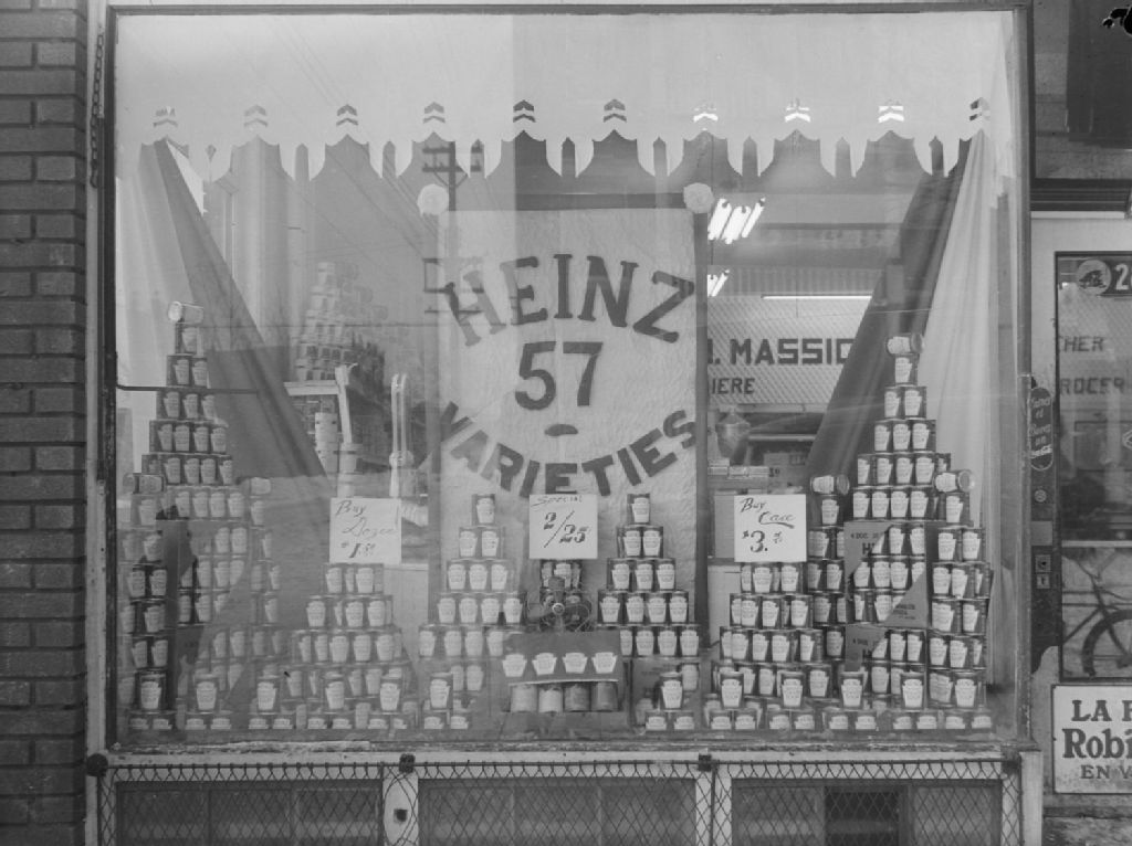 Nous voyons un étalage de soupe en conserve de la compagnie Heinz dans la vitrine de l'épicerie P. Massicotte, rue Holt à Montréal. Sur une affiche, nous remarquons l'énoncé «Heinz 57 Varieties»