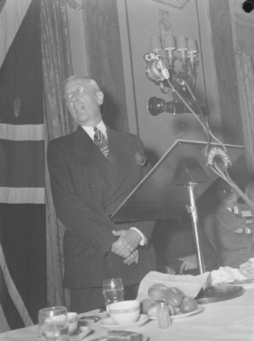 Un conférencier s'adresse aux congressistes lors du banquet du congrès annuel de la Federation of Automobile Dealer Associations of Canada (FADA) qui a lieu au Mount Royal Hotel de la rue Peel à Montréal. Ce discours est diffusé par la CBC dont nous voyons le microphone