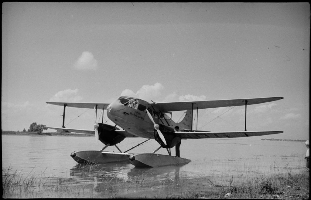 Nous voyons un hydravion portant l'inscription "Globe and Mail", amarré sur le bord d'un cours d'eau