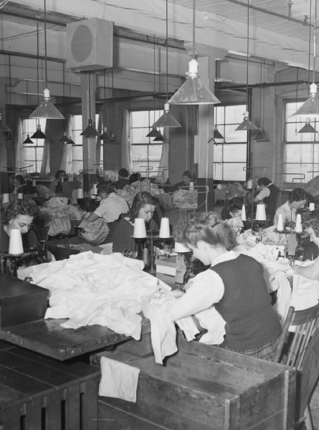 Dans la manufacture de vêtements pour hommes et dames «Tooke Bros Ltd» de la rue de Courcelle à Montréal, les travailleuses écoutent de la musique diffusée par un haut-parleur
